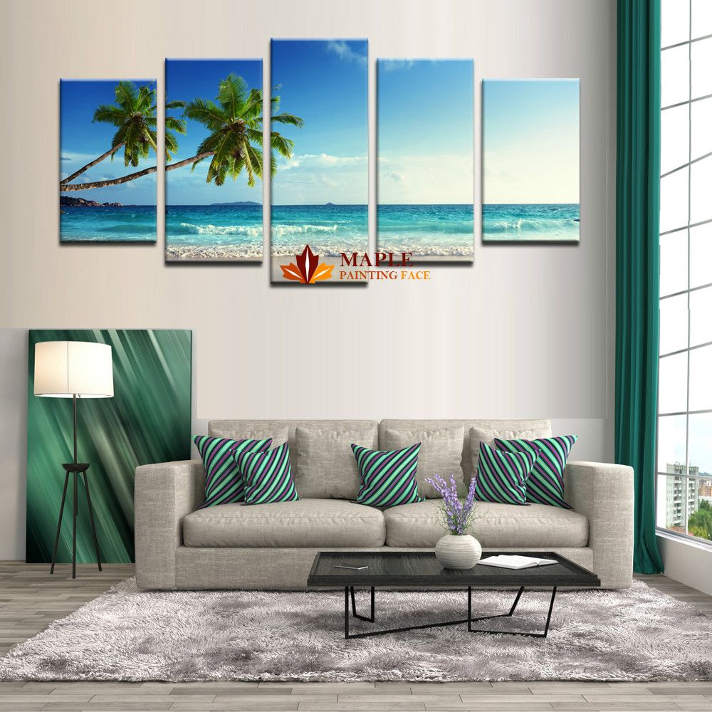 Amazon Com Hawaii Wall Pictures For Living Room Green Coconut Tree Wall Art Tropical Seascape Paintings Contemporary Artwork 5 Piece Printed On Canvas Home Decor
