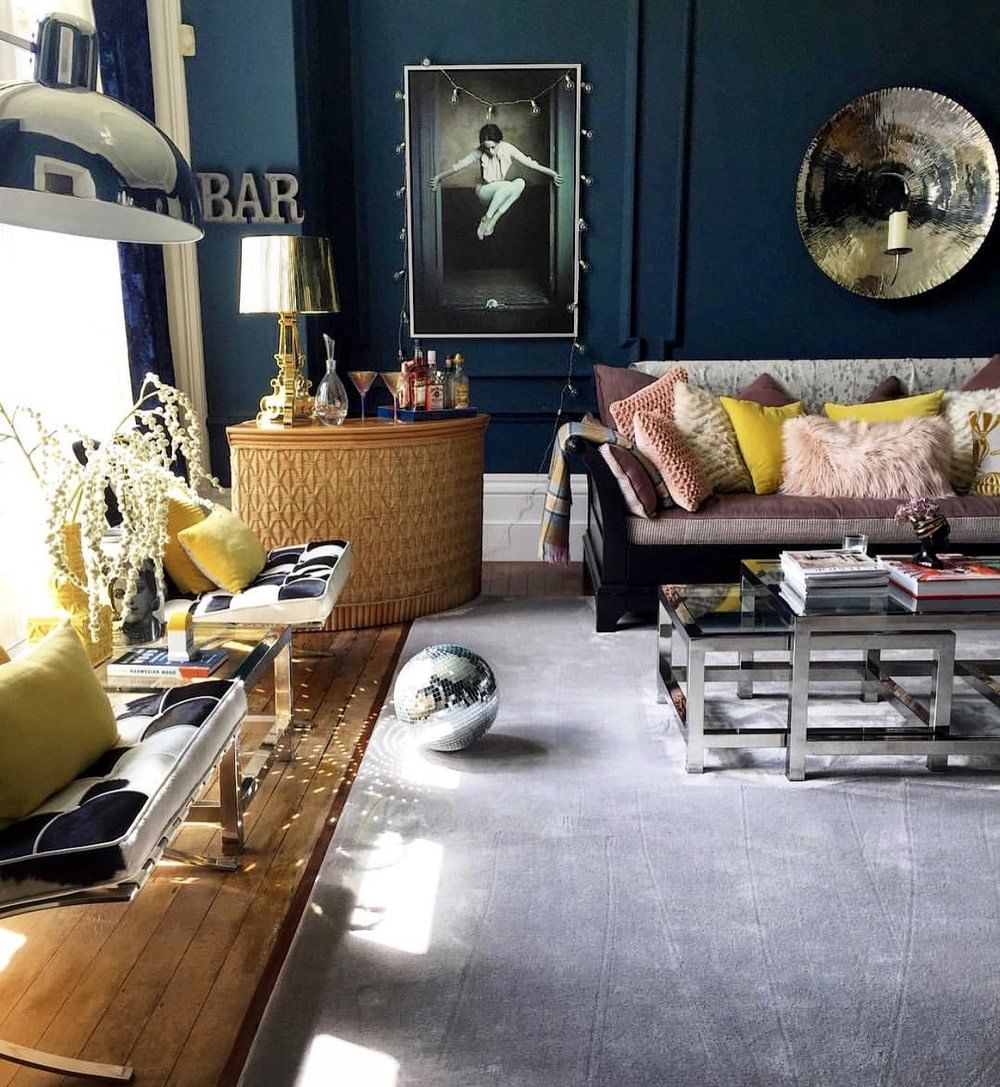 Living Room Makeover With Dark Blue Walls Pink Sofa And Gold