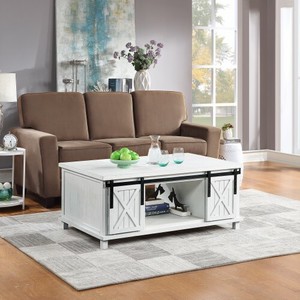Wood Distressed Coffee Table With Storage Shelf Sliding Doors