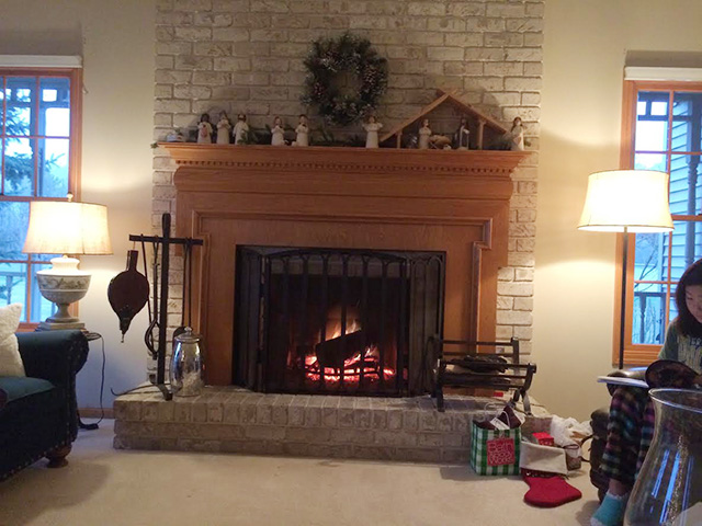 Double Sided Fireplace With Oak Trim Transitional Living Room